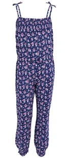 Granatowy kombinezon w drobne kwiatuszki, na ramiączkach. W pasie gumka, dekolt oraz nogawki wykończone ściągaczem. Wykonany z miękkiego i przewiewnego mater...