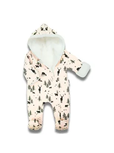 Wyprodukowano w Polsce Pajac ocieplany wykonany z zewnątrz z drukowanej bawełny dresowej. Wzór leśny przedstawiający zwierzęta: niedźwiedź, jeleń, sarna, pta...
