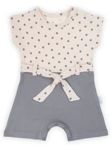 Wyprodukowano w Polsce Doskonały w ciepłe dni, rampers, posiada krótkie rękawki i nogawki. Górna cześć rampersa wykonana z łososiowej bawełny w grafitowe gro...