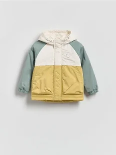 Kurtka o swobodnym fasonie, wykonana z tkaniny o podstawowej wodoodporności.