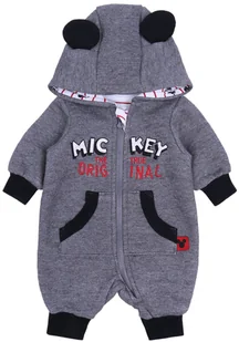 Chłopięcy, szary rampers z kapturem, zapinany na zamek. Rękawki oraz nogawki wykończone ściągaczem, z przodu dwie kieszenie. Rampers z motywem postaci Myszki Mickey.