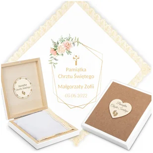 Staramy się szukać nowych pomysłów, tworzyć coś niepowtarzalnego. Zakładamy, że nasze upominki przeznaczone są na specjalne okazje, dla szczególnych osób. Cieszymy się zaufaniem wielu, często powracających klientów. PUDEŁKO + SZATKA przybliżony wymiar szatki - 26x26cm, nadruk termiczny, obszycie kremową koronką bawełnianą, pudełko drewniane w kolorze białym z pamiątkowymi zdobieniami, wymiary pudełka - 145x165 zdobienie wewnątrz napisem "Pamiątka Chrztu świętego". Ważne informacje dla kupujących! Po zakupie, prosimy o podanie w informacji do sprzedającego następujących treści: