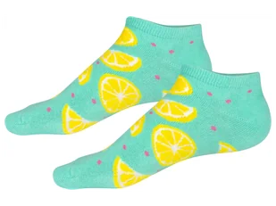 Piłka nożna, Awokado/Ananas, Banany, Zebra/Lew, Wiśnie/Kropki, Cytryny: 2 pary Kwiaty, Dinozaury/Palmy, Rekiny, Paski/Jednorożec/Tęcza, Wieloryby/Deska surfingowa, Buźka cytryny: 3 pary Materiał: Awokado/Ananas 36-40: 72% bawełna, 26% poliamid, 2% elastan 41-46: