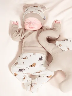 Wygodne i miękkie półśpioszki dla chłopca, uszyte ze 100% przewiewnej, kremowej bawełny w nadruk z pieskami. Wysoka jakość materiału została potwierdzona certyfikatem Oeko-Tex Standard 100 Tekstylia godne zaufania. Półśpioszki mają luźny fason i lekko obniżony stan by pomieścić pieluszkę, posiadają szeroki, bezuciskowy ściągacz w pasie, zapewniający pełny komfort maluszkowi.