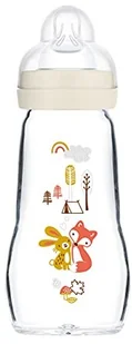Mam Feel Good butelka dla niemowląt ze szkła (260 ml), butelka na mleko z szerokim otworem, stabilna butelka do picia dla dzieci z przyssawką rozm. 1, od urodzenia, zając/lis