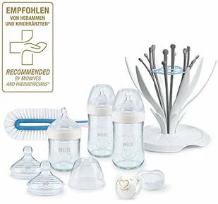 1 x butelka szklana NUK Nature Sense 120 ml S (herbatka, mleko matki), 0-6 miesięcy i 2 x butelka szklana NUK Nature Sense 240 ml M (mleko modyfikowane), 0-6 miesięcy, silikonowy smoczek z wyjątkowo szeroką, elastyczną wargą, innowacyjny zawór antykolkowy i wyjątkowo miękka strefa z wieloma otworami do picia, nasadka ochronna zamyka szczelnie, wysokiej jakości, trwałe szkło borokrzemowe, dodatkowe smoczki NUK Nature Sensebutelka wykonana z wysokiej jakości, wytrzymałego szkła borokrzemowego, dodatkowy smoczek NUK Nature Sense: 1x S (herbatka, mleko matki) i 1x M (mleko), 0-6 miesięcy 1x stojak do suszenia NUK Multi Dry do praktycznego suszenia butelek i akcesoriów 1x szczotka do butelek NUK Twist do skutecznego czyszczenia dzięki elastycznej główce szczotki 1 x silikonowy smoczek uspokajający NUK Genius My First NUK 0-6 miesięcy, ortodontyczny kształt i anatomicznie ukształtowana płytka ustna, wyjątkowo miękki i elastyczny 1 x osłonka smoczka uspokajającego NUK przezroczystaDla bezpieczeństwa i zdrowia dziecka: UWAGA: Ten produkt może być wyłącznie pod nadzorem osoby dorosłej. Smoczki nigdy nie mogą być używane jako smoczki uspokajające.