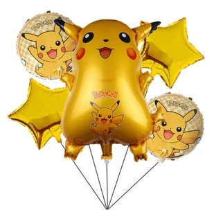 Zestaw 5 Potężnych balonów Pokemon ✅ Wymiary Pikachu: 55*42cm - 1szt. Gwiazdki: 44*44cm - 2szt. Okrągłe z Pikachu: srednica 45cm - 2szt.