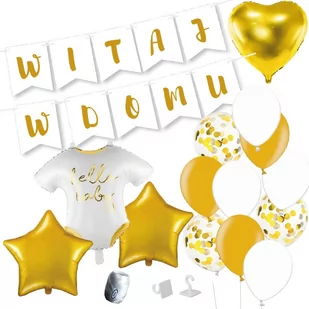 BOX POWITALNY "Witaj w domu" - Złoty Idealna dekoracja na powitanie w domu maluszka! Zestaw posiada kolorystycznie dobrane dekoracje, dzięki czemu nie musisz zastanawiać się, co będzie ze sobą pasować. Wszystko zamawiasz jednym kliknięciem! OPIS: