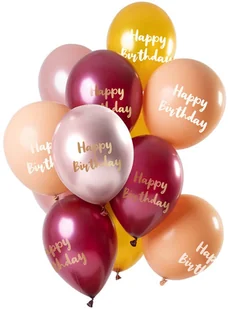 W zestawie znajdują się złote, brzoskwiniowe, jasnoróżowe i bordowe balony metaliczne z napisem Happy Birthday. Wielkość: 30 cm. Opakowanie: 12 szt (3 szt. złotych, 3 szt. brzoskwiniowych, 3 szt. jasnoróżowych, 3 szt. bordowych).