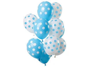 Błękitne balony w białe kropki i białe balony w błękitne kropki. Dla każdego miłośnika kropek i grochów . W zestawie znajduje się 12 sztuk, które po nadmuchaniu osiągają wielkość około 30 cm.