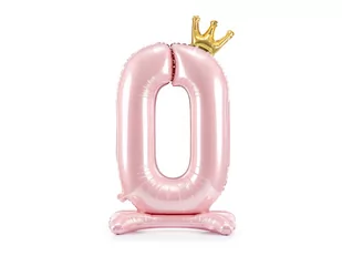 Stojący, metalizowany balon foliowy cyfra "0" w kolorze jasnoróżowym z koroną w kolorze złotym, rozmiar przed napompowaniem 103 cm (40.5''), rozmiar po napompowaniu 84 cm (33''). Do napompowania powietrzem.