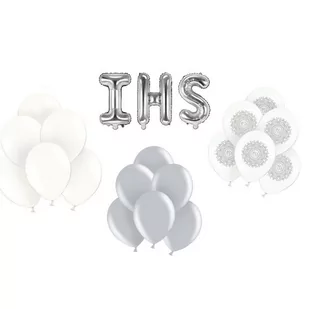Propozycja na dekorację wnętrza przyjęcia komunijnego! Ogromny zestaw balonów wykonany w odcieniach bieli i srebra to łatwy sposób na szybką ozdobę. Piękny dodatek, który oczaruje najbliższych. Balony prezentują się elegancko i pozwolą stworzyć wyjątkową aranżację. Opis: zestaw balonów na Komunię wykonany w odcieniach bieli i srebra w skład zestawu wchodzą: balony foliowe w kształcie liter IHS o wysokości 35cm każda, srebrny kolor 6szt balonów z motywem srebrnej Hostii na białym tle o średnicy 30cm 10szt balonów metalicznych Strong w białym kolorze 23cm 20szt balonów metalicznych Strong w srebrnym kolorze 23cm Zastosowanie: