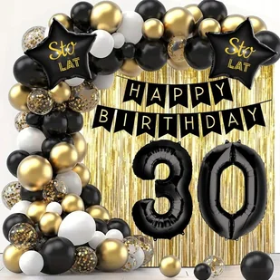 ZESTAW BALONY NA 30 URODZINY ZŁOTE CZARNE BIAŁE BANER ŚCIANKA TRZYDZIESTKA