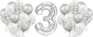 Zestaw balonów na urodziny SREBRNY W skład zestawu wchodzą: balon foliowy "3" około 70cm, 10x balony lateksowe białe (ok. 25cm) 10x balony lateksowe srebrne ...