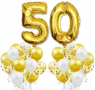 Zestaw balonów na urodziny ZŁOTY W skład zestawu wchodzą: balony foliowe "5" i "0" około 70cm, 10x balony lateksowe białe (ok. 25cm) 10x balony lateksowe zło...