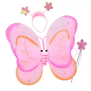 Komplet zawiera opaskę z motylkami, różdżkę i skrzydełka mocowane na gumceRozmiar skrzydełek: 52 x 40 cmKolor: różowy