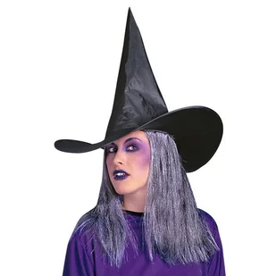 Kapelusz czarownicy. Kolor: czarny. Obwód około 58 cm. Średnica około 46 cm. Szpiczasty kształt. Brzeg ronda usztywniony drutem. Posiada przyczepione włosy w...