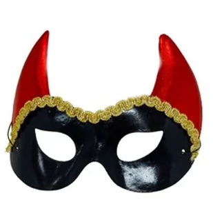 Maska karnawałowa Diablicy to atrakcyjny dodatek w iście eleganckim stylu, świetnie sprawdzi się jako element Twojej kreacji na gustownym balu karnawałowym, imprezie sylwestrowej lub też jako ciekawy dodatek na wieczór Panieński. . Maska zdobiona czerwonymi rogami oraz złotą taśmą.