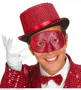 MASKA CZERWONA Z BROKATEM; Maska wykonana z usztywnionego materiału i brokatu. Kolor czerwony. Mocowana na elastycznej gumce.