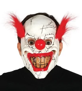 MASKA GUMOWA STRASZNY KLAUN; Maska gumowa-lateksowa. Biała twarz klauna o przeraźliwym uśmiechu z czerwonym nosem oraz wystającymi kępkami czerwonych włosów. Maska mocowana na gumce. Nie zakrywa tyłu głowy.