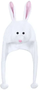 Przepiękna biała CZAPKA z pomponami imitująca KRÓLICZKA. Czapka posiada uszy, nosek oraz oczka KRÓLIKA. Pompony zostały umieszczone na długich elementach czapki, którymi możesz zawiązać sobie czapke pod szyją.