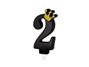 Świeczka urodzinowa cyferka dwa w kolorze czarnym ze złotą brokatową koroną. Wysokość świeczki: ok. 8,8 cm. Opakowanie: 1 szt.