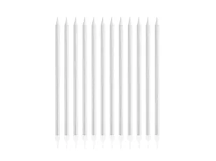 Świeczki urodzinowe w kolorze srebrnym z białymi podstawkami. Wysokość: 13,5 cm. Opakowanie: 12 szt.