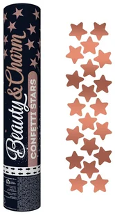 Konfetti strzelające Gwiazdki Różowo-złote w tubie Kartonowa tuba, w której umieszczone jest konfetti gwiazdki w kolorze różowego złota. Konfetti po przekręceniu tuby jest wystrzeliwane na wysokość kilku metrów dając niesamowity efekt spadającego deszczu konfetti. Konfetti jest wystrzeliwane za pomocą sprężonego powietrza, bez ładunków pirotechnicznych.