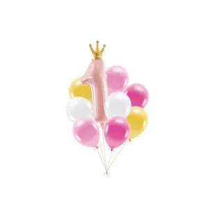 Zestaw balonów Roczek w kolorze różowym, zestaw zawiera balony lateksowe (8 szt.) i balon foliowy cyfra 1. Średnica balonów lateksowych ok. 30 cm, rozmiar balonu foliowego po napompowaniu ok. 30 x 92 cm (12 x 36''). (1 op. / 9 szt.)
