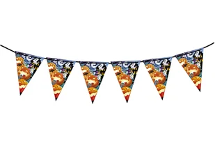 Papierowy baner flagi z nadrukiem dyni, duszków, nietoperzy i nawiedzonego domu.