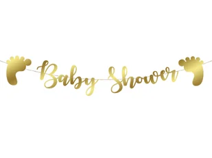 Baner wykonany z papieru w kolorze złotym z napisem Baby Shower i stópkami, idealny na baby shower.