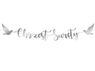 Baner wykonany z papieru w kolorze srebrnym z napisem Chrzest Święty i gołąbkami. Wysokość: ok 18 cm. Długość: 130 cm. W zestawie 5 m tasiemki.