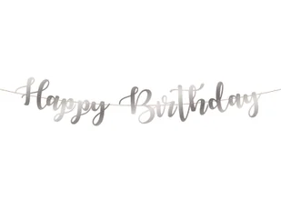 Baner wykonany z papieru w kolorze srebrnym z napisem Happy Birthday, idealna dekoracja na urodziny.