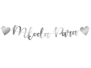 Baner wykonany z papieru w kolorze srebrnym z napisem Młoda Para i serduszkami, idealny na wesele.