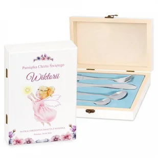 Sztućce dla dzieci zestaw w drewnianym etui z nadrukiem dla dziewczynki na chrzest