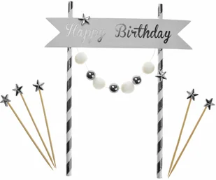 W zestawie: - topper na tort ze srebrnymi i białymi pomponikami oraz napisem Happy Birthday w kolorze srebrnym, - pikery srebrne gwiazdki (5 szt.) Idealna dekoracja tortu na urodziny. Wymiary: . Opakowanie: 6 szt.