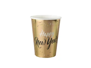 Papierowe kubeczki w kolorze złotym z napisem Happy New Year.