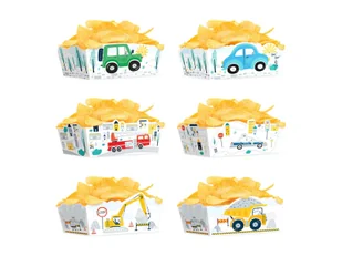 Papierowe pudełka na chipsy jak i na inne słodkości w motywie samochodzików.