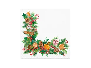 Serwetki papierowe z nadrukiem gałązek świerku, szyszek, pierniczków i pomarańczy.