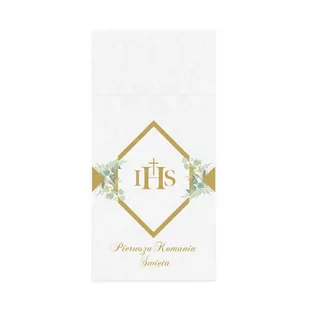 Serwetki papierowe z kieszonką na sztućce. Motyw I Komunia Święta. Wymiary: przed złożeniem 20cm x 10cm, po rozłożeniu 40cm x 40cm. W zestawie 16 sztuk. Kolor: biało- złoty.
