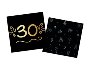 Serwetki 2-warstwowe papierowe w kolorze czarnym z urodzinowym nadrukiem oraz złotą liczbą 30.