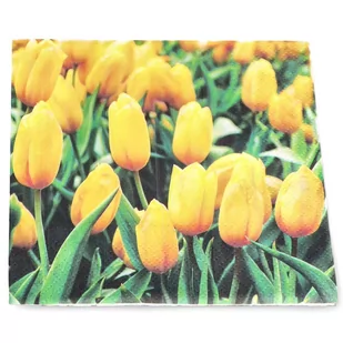 Serwetki papierowe tulipany Serwetki papierowe jednorazowe z nadrukiem w żółte tulipany. Pięknie prezentują się na stole, wśród innych elementów aranżacji. Nadają się na różne okazje, dzięki kwiatowemu motywowi. Serwetki są nieodłącznym elementem stołu na przyjęciu. Żółto-zielona kolorystyka sprawia, że przyciągają wzrok.