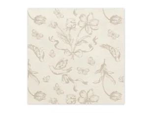Serwetki papierowe w kolorze beżowym z ciemnobeżowymi kwiatami oraz ptakami.