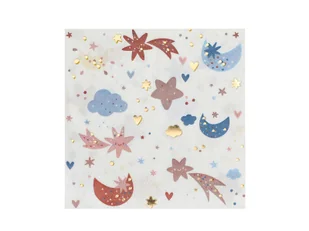 Serwetki papierowe z pastelowym nadrukiem gwiazdek, księżyców, chmurek ze złotymi metalizowanymi elementami.