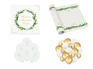Zestaw dekoracji na stół na I Komunię Świętą.