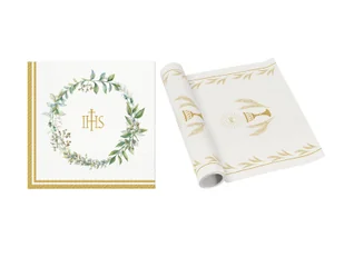 Zestaw dekoracji na stół na I Komunię Świętą.
