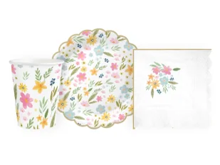 Zestaw papierowy w kolorze białym z nadrukiem polnych kwiatków. Idealny np. na baby shower, urodziny lub wieczór panieński w stylu boho. W komplecie: