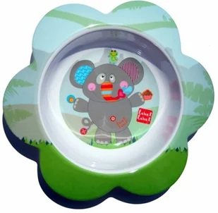 Kolorowa miseczka z melaminy w kształcie kwiatka, z motywem słonika zachęci każdego niejadka do zjedzenia posiłku.