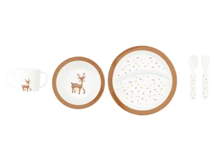 ok. 13,5 cm (dł.); lis Emmy: talerz: ok. 20,8 cm (Ø), miseczka: ok. 15,3 x 3,6 cm (Ø x wys.), kubek z uchem: ok. 12 x 6,5 cm (szer. x wys.), sztućce: ok. 13,5 cm (dł.); sarenka Flöckchen: