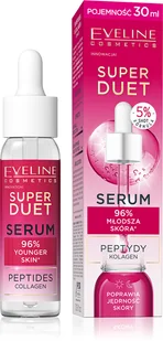 Eveline Super Duet Serum z Kompleksem Peptydów i Kolagenu 30mlSkoncentrowane serum o działaniu napinająco-odmładzającym, które wspiera procesy odnowy skóry. Połączenie peptydów i kolagenu zauważalnie poprawia elastyczność i redukuje widoczność zmarszczek. Formuła zawiera 5% kompleks peptydów i kolagenu, wspierając skórę w odzyskaniu sprężystości oraz gładszego wyglądu. Regularne stosowanie pomaga zminimalizować linie i przywrócić cerze bardziej młodzieńczy wygląd. Serum polecane jest cerze dojrzałej, suchej, pozbawionej jędrności oraz z widocznymi liniami i zmarszczkami — idealne jako codzienne wsparcie pielęgnacji anti-age.